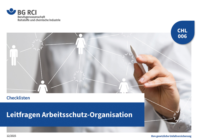 Eine geeignete Organisation für Sicherheit und Gesundheit bei der Arbeit ist gesetzlich gefordert und trägt gleichzeitig dazu bei, dass der Betrieb effizient und auf Dauer ungestört läuft. Mit den Fragen der Checkliste „Leitfragen Arbeitsschutz-Organisation“ können Sie in einschätzen, inwieweit Handlungsbedarf bei Ihrer Organisation für Sicherheit und Gesundheit besteht. Die Checkliste konzentriert sich auf die wesentlichen rechtlichen Pflichten und Aufgaben im Arbeitsschutz und ist für Unternehmen jeder Größe geeignet.